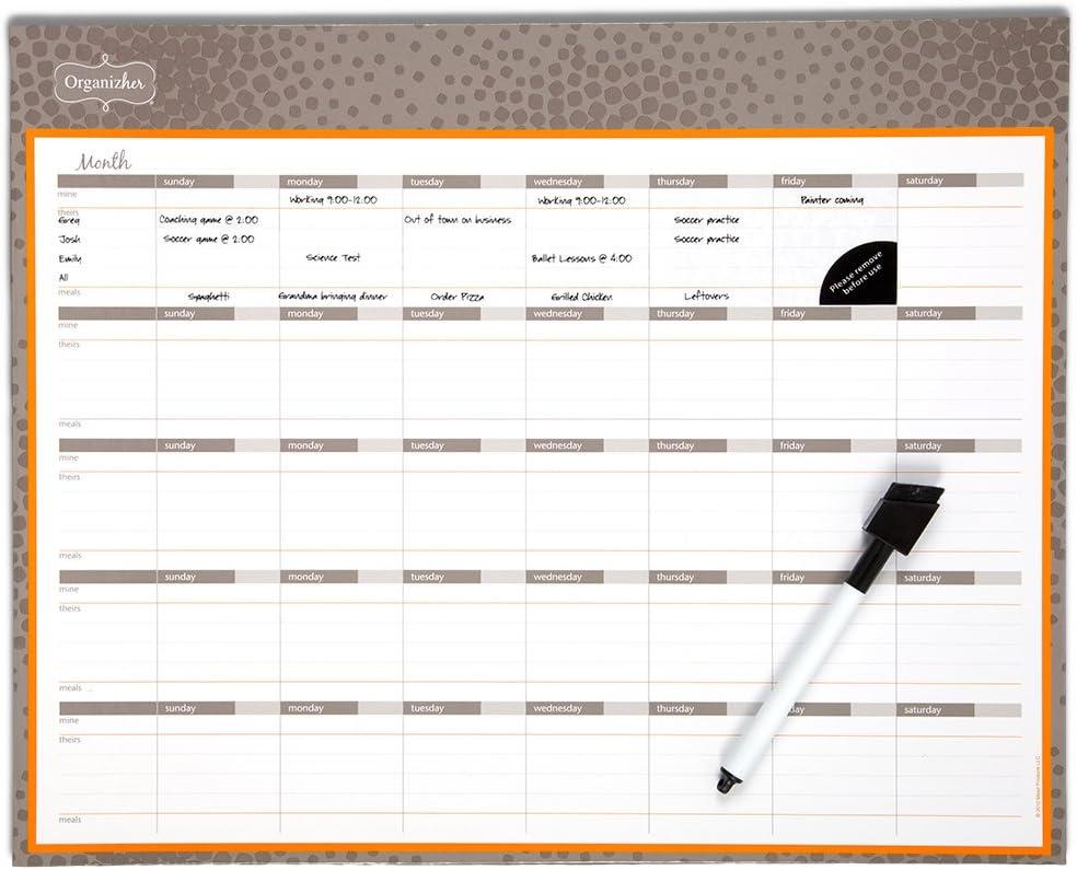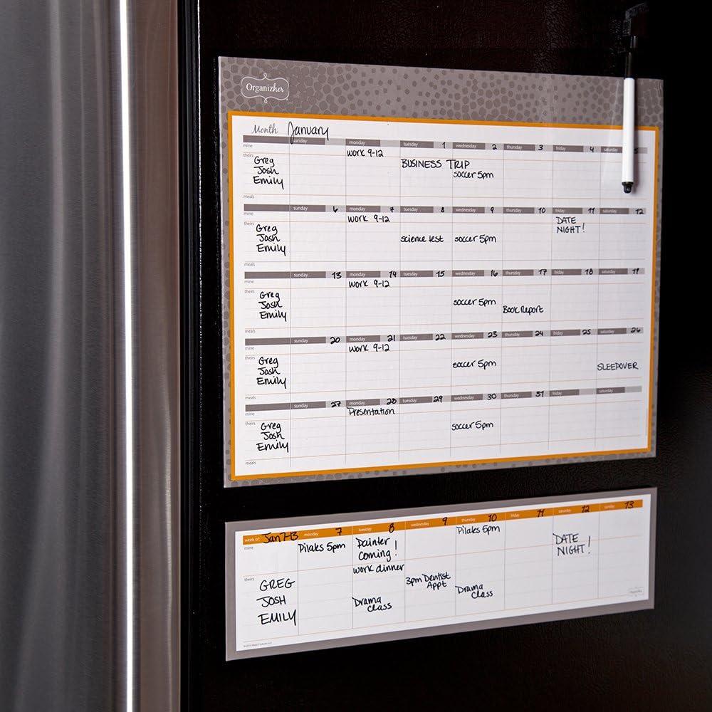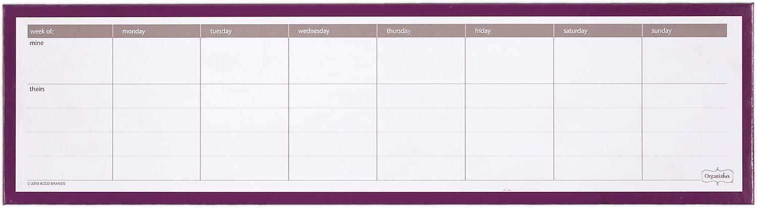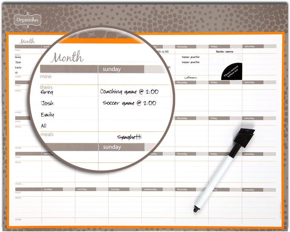 Being a Mom is a full-time job. You're the queen of budget tracking and meal planning, juggler of multiple schedules and deadlines, and an all-around miracle worker. Designed with busy households like yours in mind, Mead Organizher products help bring all of the hats you wear together under one coordinated system that allows you to organize, track and plan, so keeping up with the pace of family life is easier and less stressful. The Organizher Write ‘N Wipe Weekly Undated Calendar is a reusable, undated dry-erase planner that allows you to view the month at once with designated areas for your schedule, your family and friends' schedules. It easily attaches to any magnetic surface and includes a black dry-erase marker. 15 x 4 inch calendar includes white ruled blocks with pink and orange accents.